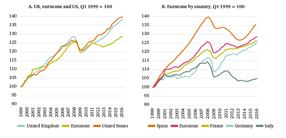 The UK, together with the US, was one of the countries most severely hit by the 2008–09 crisis because of the size of its financial sector, which accounted for approximately 9 per cent of total output in 2008.4 Yet it has recovered relatively quickly (see Figure 1, Panel A). Between 2010 and 2015, real GDP growth in the UK averaged 2 per cent, slightly above the average rate of growth for the G7 as a whole.5 In contrast, real GDP growth in the eurozone averaged 0.9 per cent over the same period.6