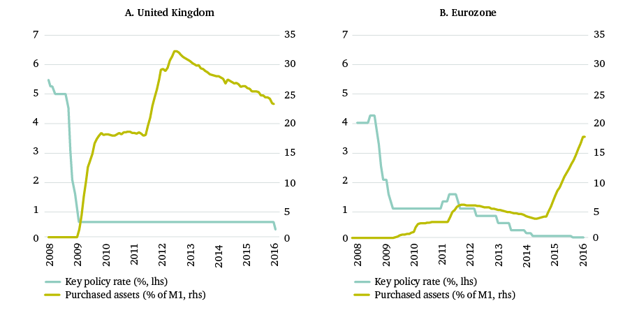 As shown in Figure 3, the initial cuts in official interest rates in 2008 and 2009 were larger in the UK than in the eurozone. What is more, the response of the European Central Bank (ECB) was impeded by having to reverse policy tightening, as the bank had initially hiked rates at the start of the crisis in 2008 and then did so again twice in 2011. With hindsight these rate hikes were premature. They probably damaged the ECB’s credibility and may have rendered subsequent action less effective than it would otherwise have been. The ECB also started unorthodox asset purchases much later than the Bank of England did, and its ‘quantitative easing’ (QE) still has a long way to go before matching that of the UK in relative terms. QE is generally thought to stimulate economic activity through a range of channels, for example by encouraging investors to rebalance their portfolios towards alternative assets (stocks, corporate bonds, foreign assets). It was developed as a means of easing financial conditions when official interest rates are at or near zero – when the scope for conventional monetary policy easing is therefore constrained by what economists call the ‘zero lower bound’. Figure 3 suggests that the ECB has only now reached the same scale of asset purchases that the Bank of England achieved in 2011. At its current pace of asset purchases, €80 billion per month, the ECB would have to continue QE for at least another year in order to match the scale of balance sheet expansion in the UK.