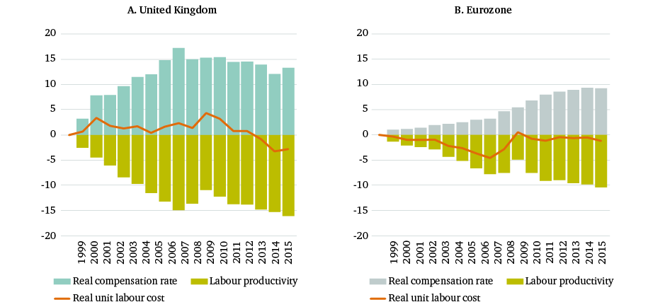 Yet the durability of the UK’s productivity advantage vis-à-vis Europe is by no means clear. During the global financial crisis, the loss in employment and output per worker was quite similar for both the UK and the eurozone.18 However, the initial rebound in output in 2010–11 relied heavily on a surge in output per worker in the latter, whereas in the UK the recovery was more a reflection simply of greater numbers of people taking up work. Moreover, labour productivity growth in the UK has not reverted to the rates that were normal pre-crisis; in 2015 productivity grew by only a tenth more than in the eurozone.