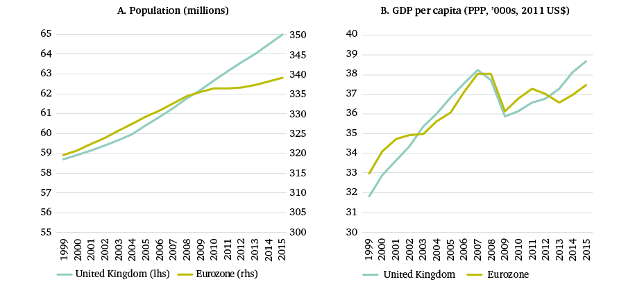 If macroeconomic and crisis resolution policies have been more favourable to recovery in the UK than in the eurozone, to what extent has the eurozone’s very mixed record on liberalizing labour and product markets made a difference to its growth outlook? Another potential factor to consider is the interaction of both economies with the rest of the world, namely the extent to which each has been able to draw on the import of human and financial capital to kick-start and sustain its recovery. This is of particular importance to the UK, not least in the light of the ‘Brexit’ vote, which may make it more difficult to rely on external sources of potential growth in future.